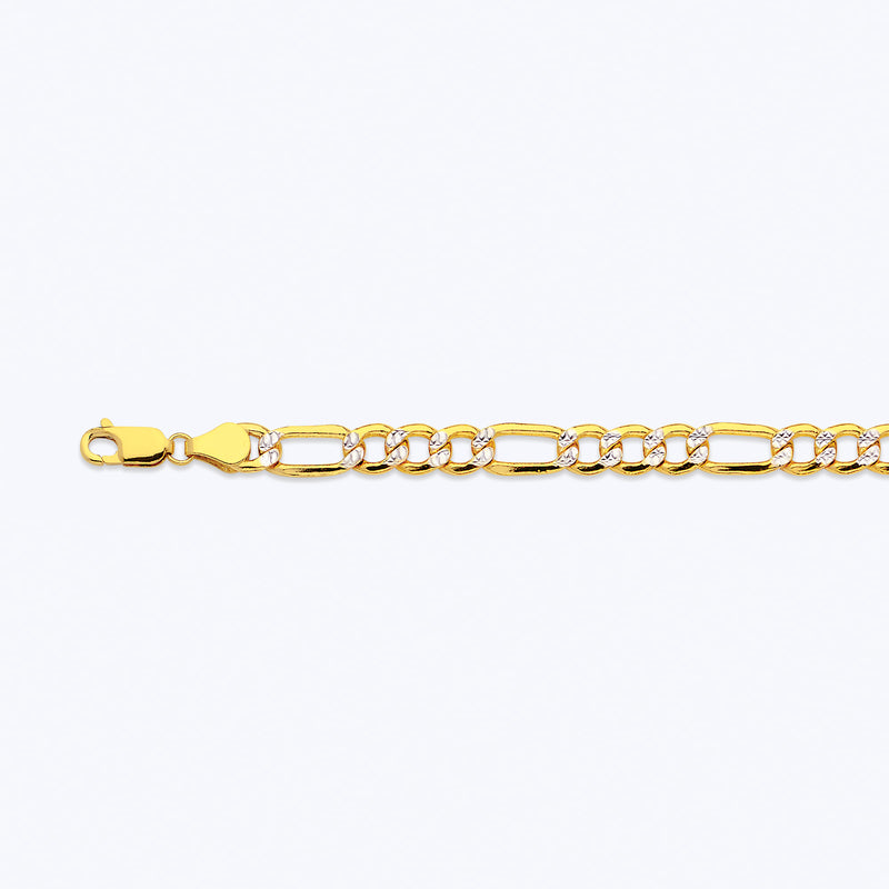 This 10 Karat Yellow Gold Hollow Pave Figaro Chain is a beloved classic worldwide. Made from authentic 10k yellow and white gold, it features two to three small circular links that connect to a long oval link, giving the chain a unique appearance. The center of the curb links is adorned with pave detailing that adds sophistication and elegance to your style. The chain comes in various lengths to suit your preference and weighs approximately 0.56 grams per inch.