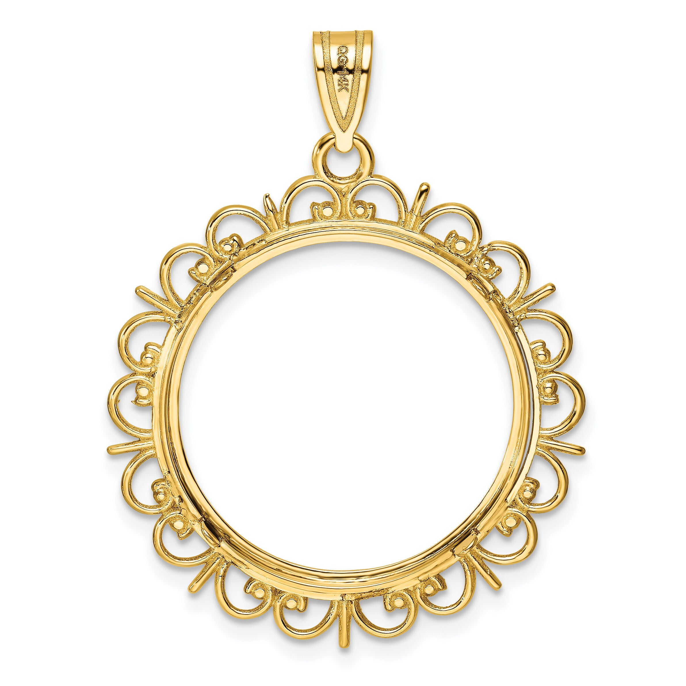| Description: | 14k Polished and Diamond-cut Fancy 22.0mm Prong Coin Bezel Pendant |