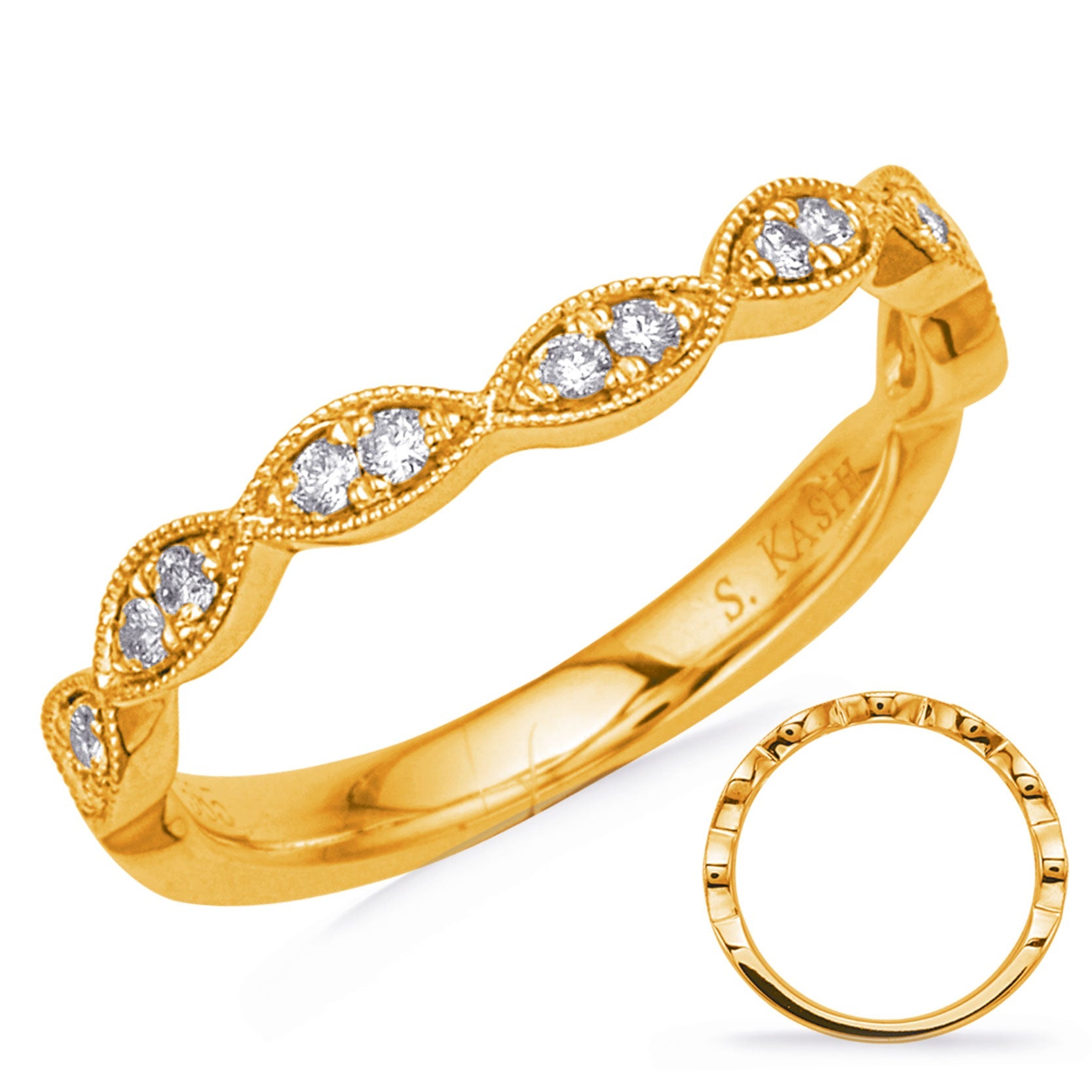 This Band is available in 14K Yellow Gold. There are a total of 14 stones. There are Rounds with a total carat weight of 0.16 set in a Micro Pave|Micro Prong setting.