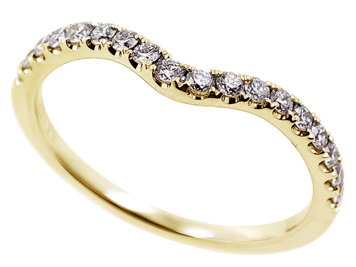 This Band is available in 14K Yellow Gold. There are a total of 18 stones. There are Rounds with a total carat weight of 0.26 set in a Prong Set setting.